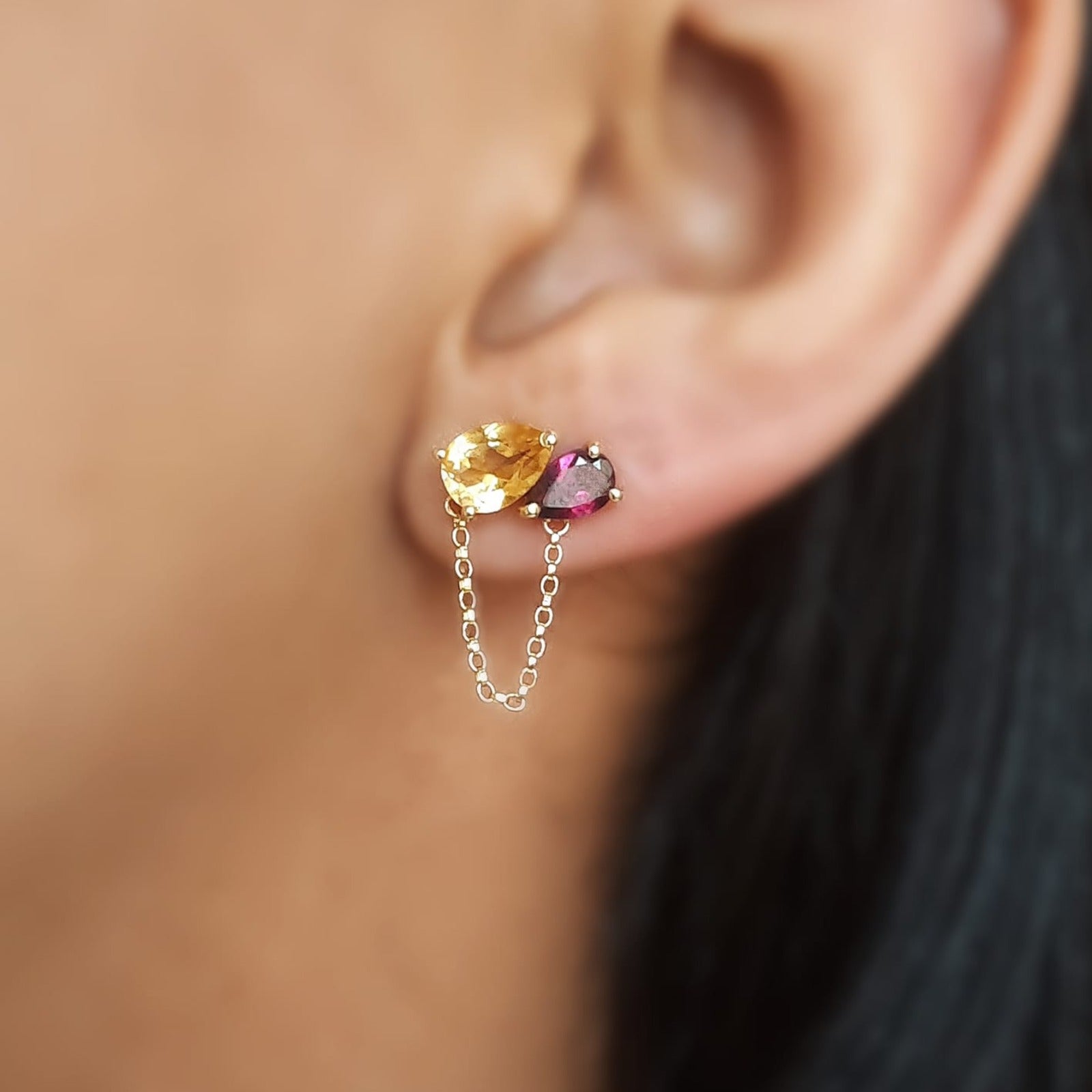 Pedras: 2 citrinos gota 5x7mm; 2 rodolitas gota 4x6m