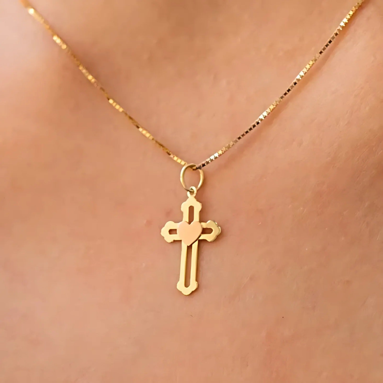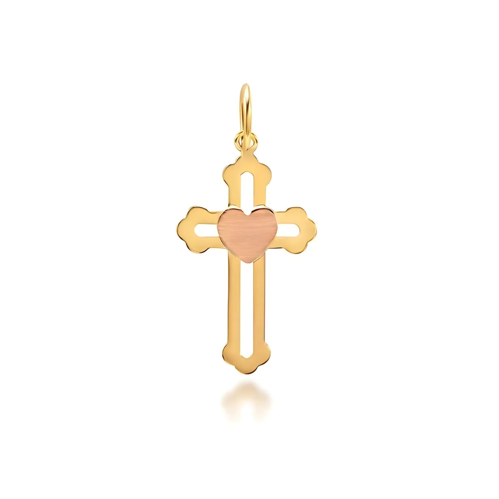 Pingente Ouro Amarelo 18K Cruz com Coração Ouro Rose 18k